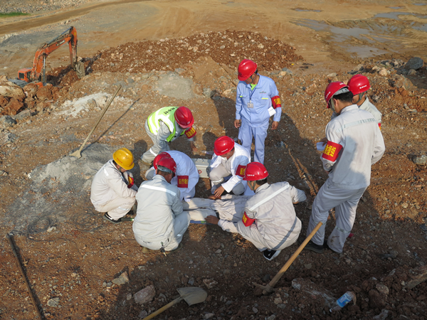 演练模拟矿山施工作业面35平台进行爆破作业,由于炮孔充填深度不够,导致冲孔现象,产生飞石,现场管理人员在矿区北侧警戒时,被爆破飞石砸中,导致部受伤,伤势严重。总指挥在接到救援电话后,立即启动三级应急预案,通知办公室各应急小组就位矿山应急救援队员携带专业救援装备,驾驶应急救援车,拉警报,火速赶赴事故现场。到达现场后,立即判断受伤人员伤情,及时救出并进行止血包扎、固定等简单处理后由救援队员用担架抬上120救护车,并送往就近医院救治演练过程中各应急小组各司其职、协同作战、反应迅速,整个演练过程在快速、紧张、有序的氛围中进行圆满完成了各项预定任务。