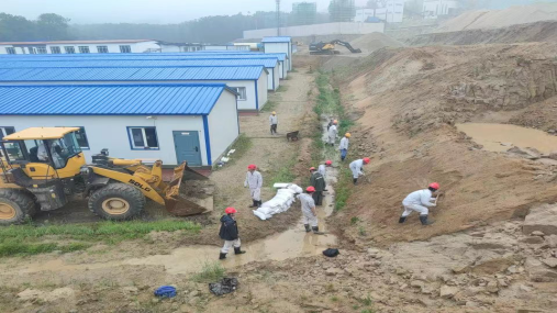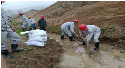 2022年6月20日早6点,接应急管理部门通知吉林地区预计未来24小时内将有强降雨,舒兰分公司项目经理宋宪军紧急通知各科室人员,组织对现场、生活区、炸药库、维修车间等地点进行了防汛设施检查。生活区东侧边坡被临近公司时候后未进行修整,加之连续降雨一整夜,东侧边坡垮塌,淹没排水沟,造成堵塞。 接到通知后,生产科,立即调用装载机赶到现场,组织员工带好防汛装备赶到现场。现场负责人周浩讲“装载机立即清理边坡上的塌陷料,生产科组织人员去上游疏通水道,安全科和设备科组织人员去边坡上面挖掘水沟设置挡墙,避免水流二次破坏边坡”,任务分配完毕后,各科室带领人员紧锣密鼓的组织起来。
