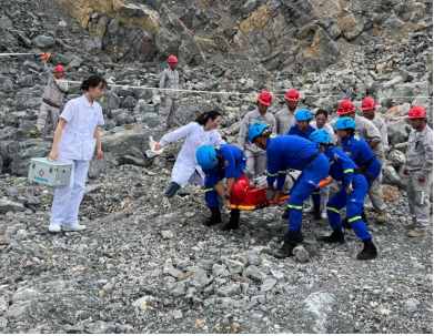 演练开始,总指挥张鹏收到现场有发生块石滚落,造成现场技术员腿部受伤请求救援的紧急报告,立即下达指令启动分公司应急预案,并对本次救援进行全面组织部署,对分公司警戒保卫组、抢先救援组、医疗救护组、通讯联络组等下达指令,各小组在接到指令后立即响应应急预案,第一时间到达事故发生地,按秩序组织抢险救援,对伤员进行紧急救治并对事故发生地进行警戒隔离。