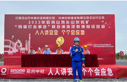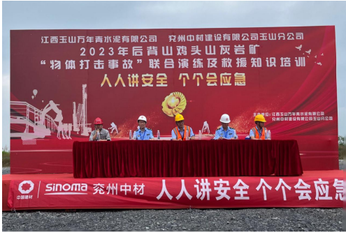 为深入宣贯党的二十大精神和习近平总书记关于安全生产重要论述,进一步树牢“以人为本、安全发展”的安全生产管理理念,贯彻“安全第一、预防为主、综合治理”的安全生产方针,强化非煤矿山事故应急救援管理工作和应急救援队伍建设,切实提高分公司应对矿山突发事故的联合应急救援综合能力,6月17日,兖州中材玉山分公司联合江西玉山万年青水泥有限公司、玉山县蓝天救援队、玉山县人民医院等举办2023年“物体打击事故”联合演练及救援知识培训活动。玉山县应急管理局局长吴高峰、玉山万年青水泥有限公司总经理李跃华等出席本次活动并致辞。