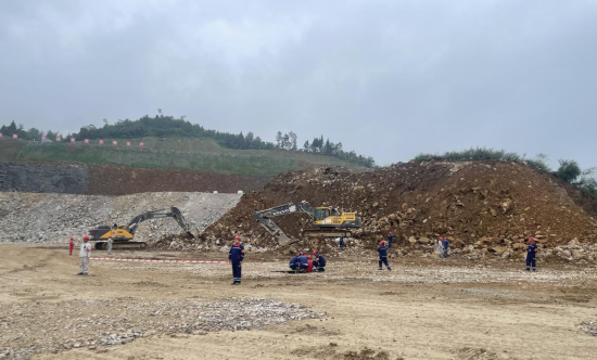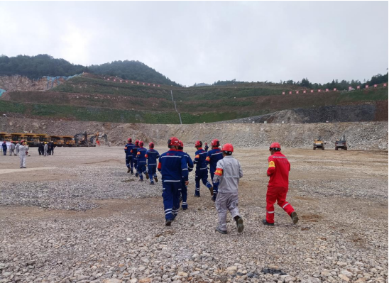演练现场模拟遇强降雨后边坡发生垮塌事故,在接到险情报告后,应急指挥部立即启动应急预案,组织各救援小组赶赴现场